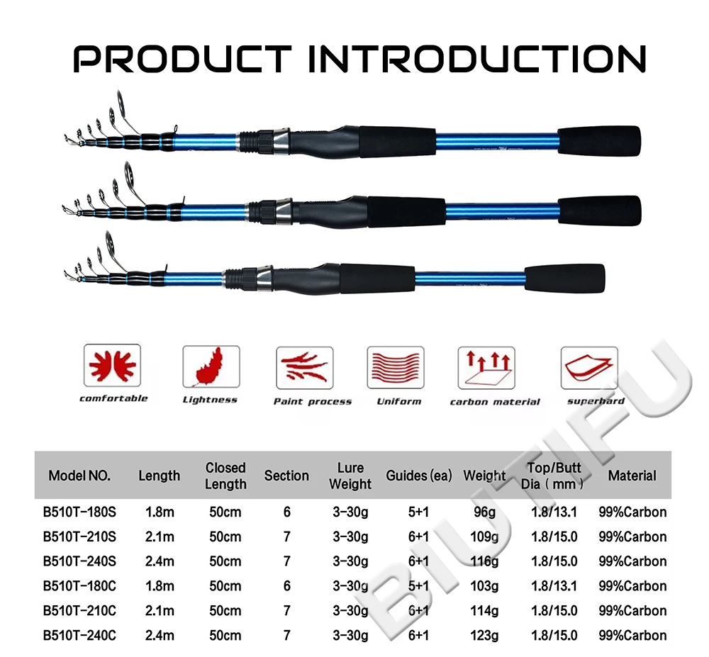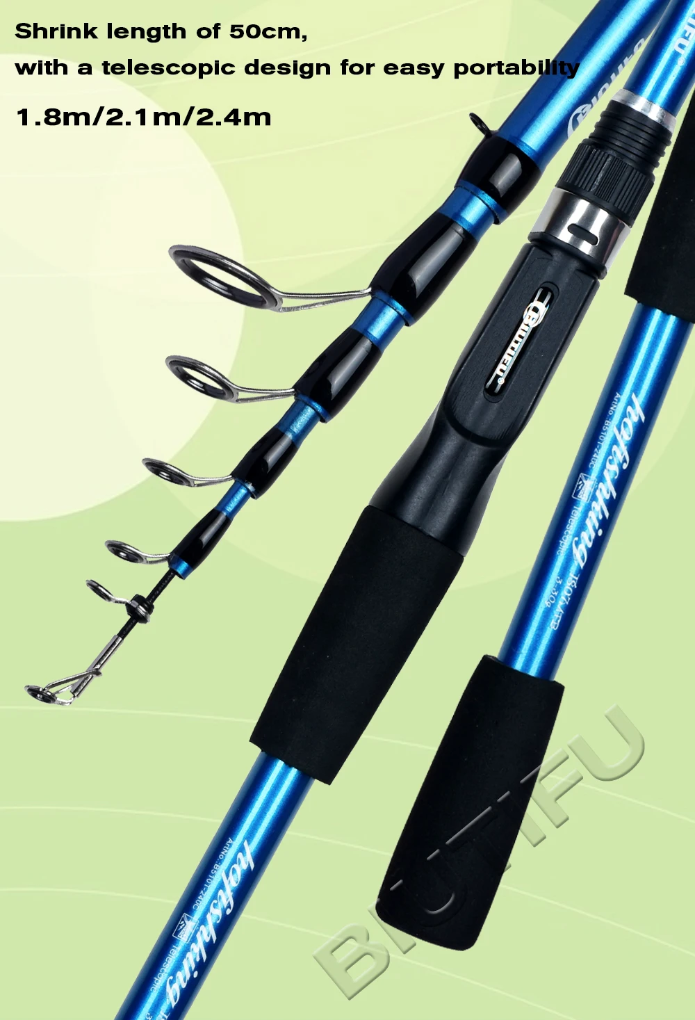 1.Shrink length of 50cm, with a telescopic design for easy portability; 2.The guide ring adopts high wear-resistant LTS magnetic ring; 3.Tip is made of high elastic fiber cloth, which has light hand feel, high sensitivity and good strength; 4.Made of environmentally friendly high-performance paint and laser marking; 5.The interface adopts the gapless fitting method, and the tonality is perfectly presented; 6.Use a round hook; 7.The single-piece EVA handle is used, which is non-slip, comfortable and wear-resistant; 8.Use cloth bags for packaging. 9.The high strength cap prevents the rod from colliding during carrying.